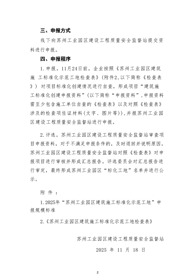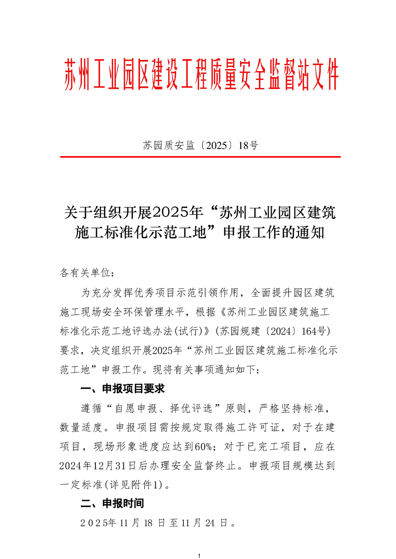 關(guān)于組織開展2025年“蘇州工業(yè)園區(qū)建筑施工標(biāo)準(zhǔn)化示范工地”申報(bào)工作的通知