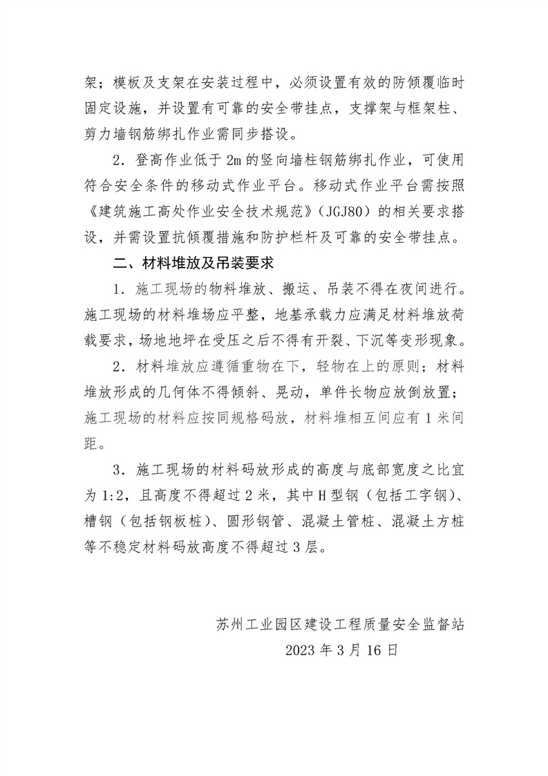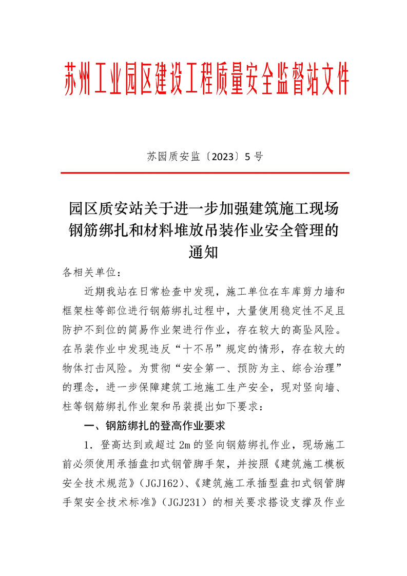 園區質安站關于進一步加強建筑施工現場鋼筋綁扎和材料堆放吊裝作業安全管理的通知