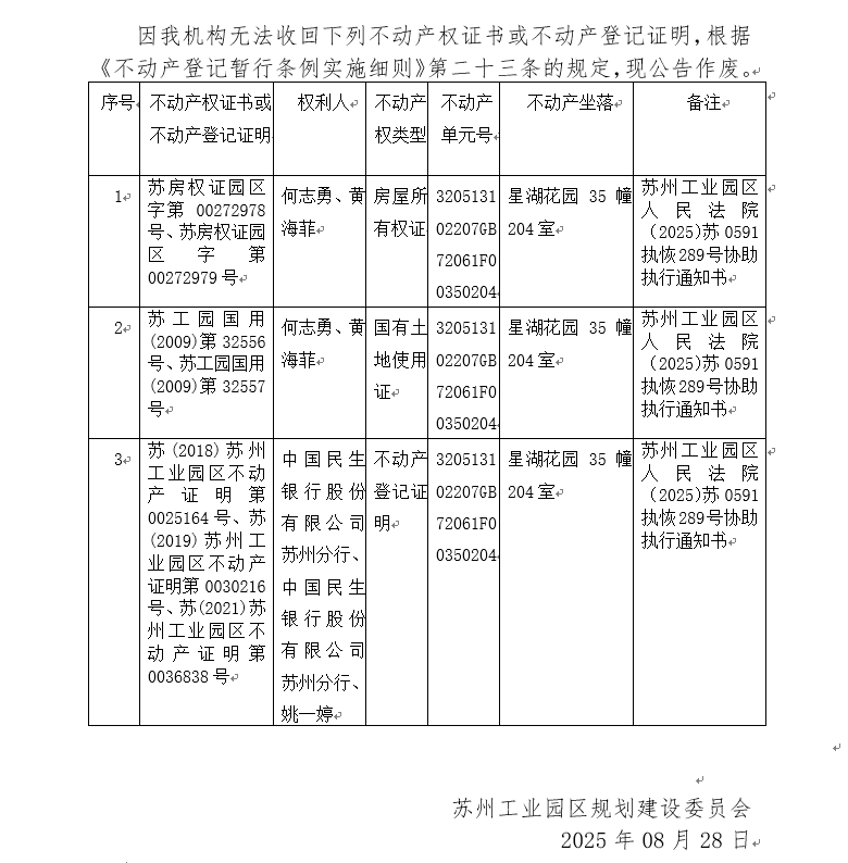 不動產權證書/登記證明作廢公告蘇園 證廢字2025(0133)號(星湖花園35幢204室)