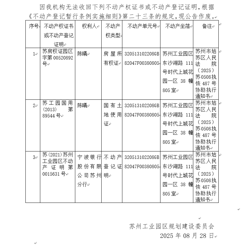 不動產權證書/登記證明作廢公告蘇園 證廢字2025(0132)號(時代上城花園一區38幢805室)
