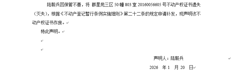 關(guān)于群星苑三區(qū)50幢803室20160056605不動產(chǎn)權(quán)證遺失聲明