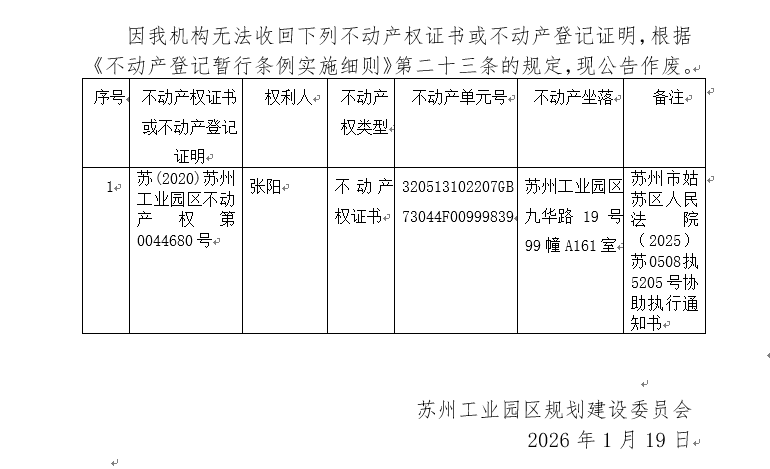 不動產(chǎn)權(quán)證書/登記證明作廢公告蘇園 證廢字2025(0210)號(蘇州工業(yè)園區(qū)九華路19號99幢A161室)