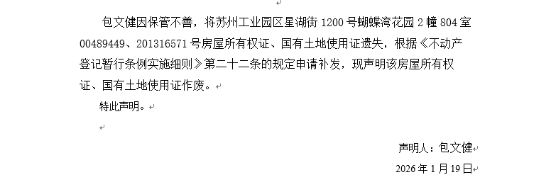 關于蘇州工業園區星湖街1200號蝴蝶灣花園2幢804室00489449、201316571號房屋所有權證、國有土地使用證遺失聲明