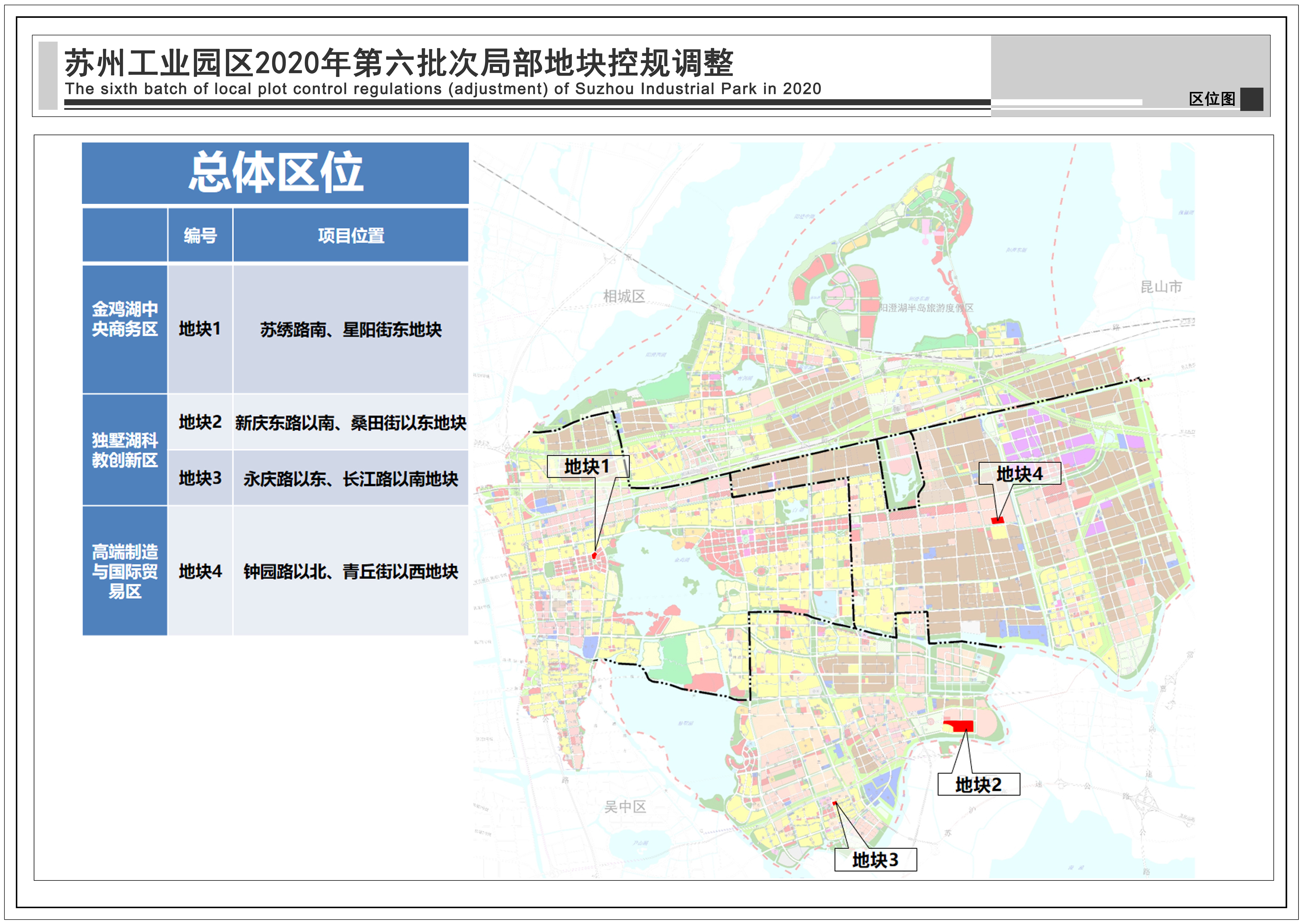 蘇州工業園區2021年第二批次局部地塊控規調整:共包括4個地塊,總用地面積35.45公頃,詳見附圖區位圖。