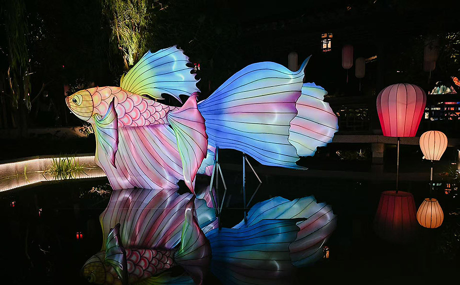 除了美輪美奐的沉浸式光影秀,斜塘老街還隨機點綴了各式精巧花燈:靈動的玉兔燈伏于巷角,躍動的鯉魚燈懸于樹梢,與流水、月光相映成趣,為傳統佳節更添幾分韻味。與此同時,斜塘老街游園會仍火熱進行中,處處洋溢著溫馨的節日氛圍。