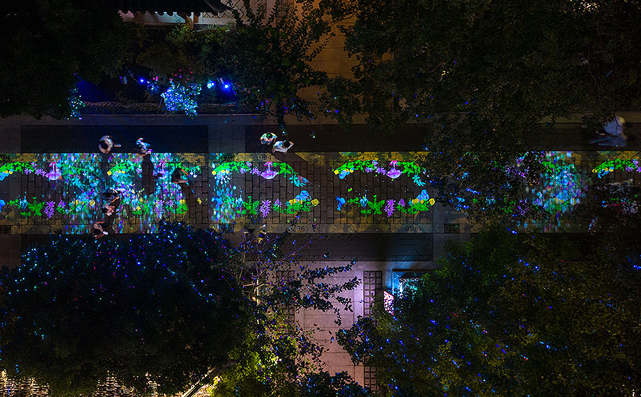 懷夢內街同樣夢幻非常,青磚黛瓦在數字光影的勾勒下仿佛被“喚醒”,流動的光影講述著老街新的故事,營造出一步一景的沉浸式夜游空間。