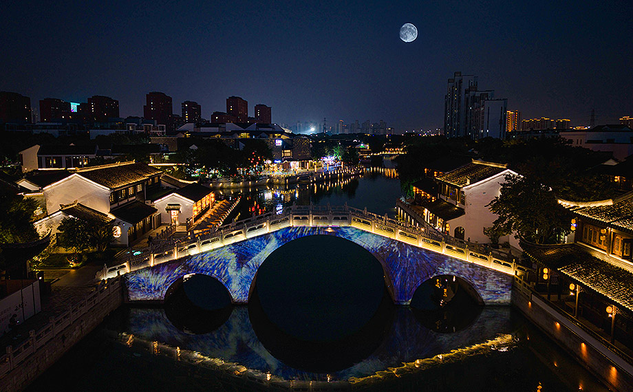 節日期間,斜塘老街精心打造的光影秀頻頻吸引市民游客駐足流連。傍晚時分,華燈初上,隨著“斜塘秘境?光影奇遇”光影秀亮燈,攬月橋流金溢彩,變幻的光影點亮了城市夜色,并與空中明月相映成趣,構成一幅美妙的圖景。