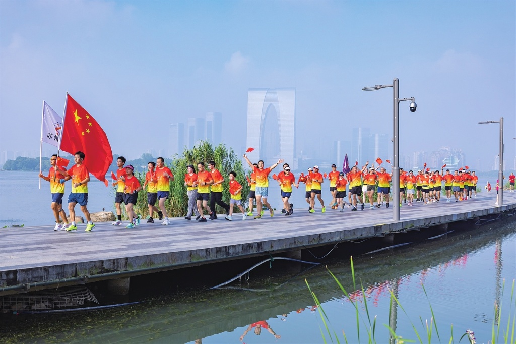 昨天,蘇州工業園區金雞湖畔,一群跑友開展國慶長跑活動,以奔跑之姿為祖國母親慶生。查正風攝(視覺蘇州供圖)