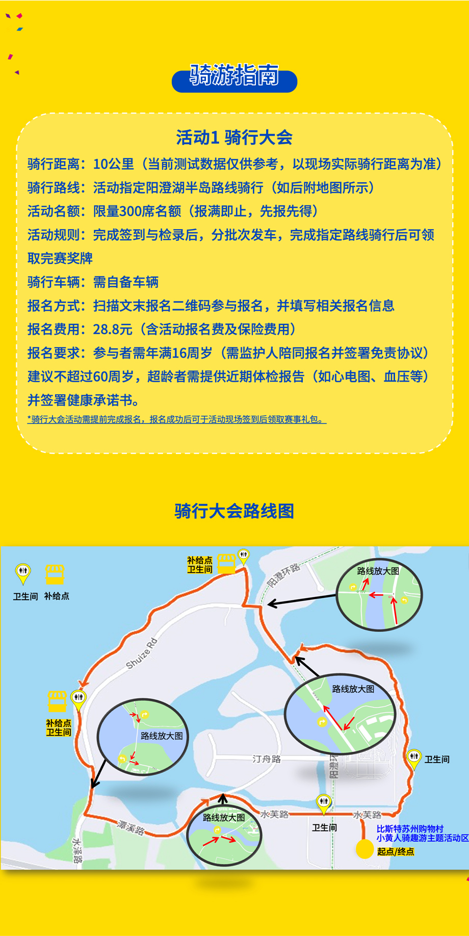 此次活動分為騎行大會、騎趣游體驗兩種形式,騎行大會需自備車輛、按照指定路線騎行,騎行距離約為10公里,參與者需年滿16周歲,完成指定路線騎行后可領取完賽獎牌,報名費用為28.8元;騎趣游體驗也需自備車輛,可在陽澄湖半島旅游度假區內自由騎行,騎行距離為10公里以上(需出示在陽澄湖半島騎行的GPS路線記錄),完成騎行后可獲得紀念獎牌(限量200席名額),該項活動無需報名,可憑借碼表或手機APP的GPS路線記錄領取紀念獎牌。