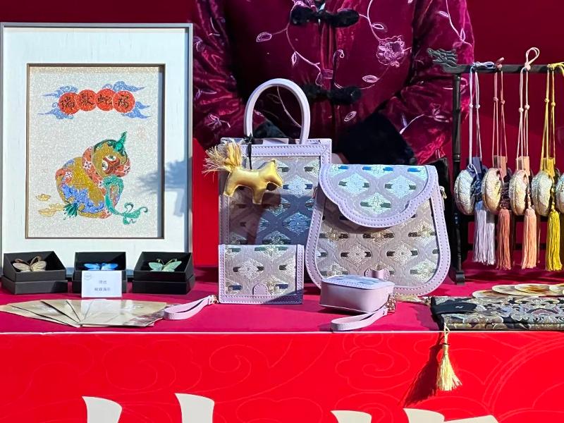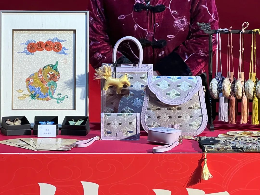 “這幅作品是福蛇獻瑞,采用緙繪結合的工藝,不僅寓意好,還是藝術跨界。這款蝴蝶胸針,采用緙絲面料、盤扣工藝,是兩項非遺技藝的結合體。這組紫色包具,設計時尚典雅,用的則是西陣織面料,也是非常珍貴的織造技藝!……”展位前,仁和織繡總經理、高級工藝師謝晴容細數家珍,為市民游客介紹著產品特色和織造工藝。