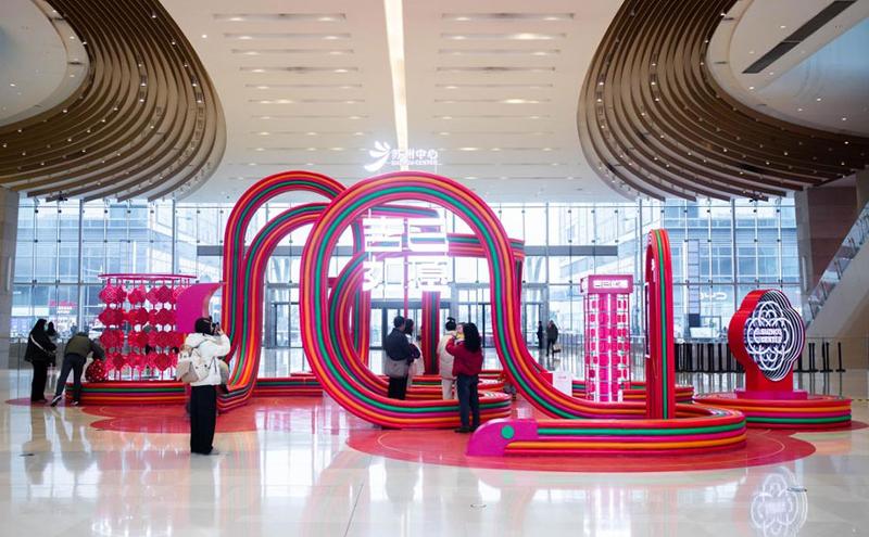 在蘇州中心商場,被古人賦予美好寓意的中國結以靈蛇造型在一樓中庭驚艷亮相,帶來“靈蛇繞福,凝心啟運”的新年祝福,靈蛇的體態蜿蜒流暢,與中國結的線條完美融合,形成了獨特的視覺美感。
