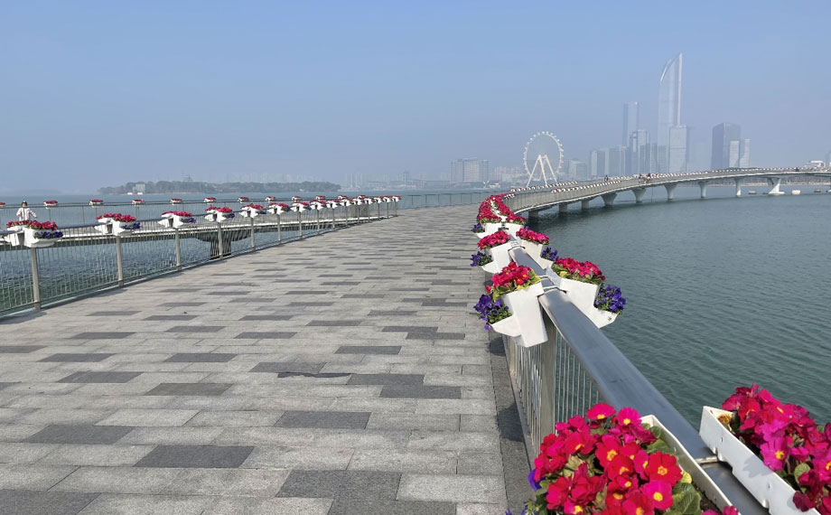在蘇州大道(現代大道-月廊街)、金雞湖人行棧橋、金雞湖大橋及飛翔雕塑等重要窗口區域,三千多組馬鞍式花箱煥新亮相。