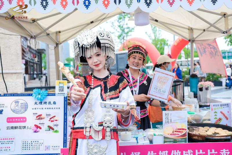 “龍舟有好市”民族美食市集同樣人氣爆棚,美食市集匯集30余個美食攤位,來自23個不同民族美食香氣四溢,打造舌尖上的“民族風”,為現場市民游客提供充足能量補給。剛出爐的烤乳扇滋滋作響,刷上玫瑰醬,甜香撲鼻;軟糯的朝鮮打糕裹著豆面和糖粉,引得游客們紛紛駐足購買品嘗。