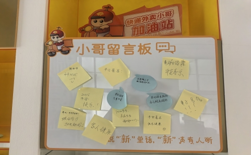 這里召開了“新就業(yè)群體座談會”,通過面對面與美團、餓了么、叮咚買菜等小哥交流,了解他們的實際需求等。客廳內(nèi)設(shè)置有“小哥留言板”,讓您心煩可傾訴、“新”聲有人聽。
