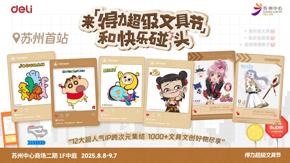 開學倒計時,裝備先到位。8月8日至9月7日,“得力超級文具節”限時登陸蘇州中心商場,為廣大學生黨、文具控和二次元愛好者帶來一場文創盛宴。作為蘇州首場得力大型IP文具快閃,活動現場集結12大人氣動漫及文創主題,1000+文具文創好物,推出實付滿額即贈限定文具福袋,吸引眾多學生與年輕消費者打卡,在挑選文具的過程中感受創意樂趣。