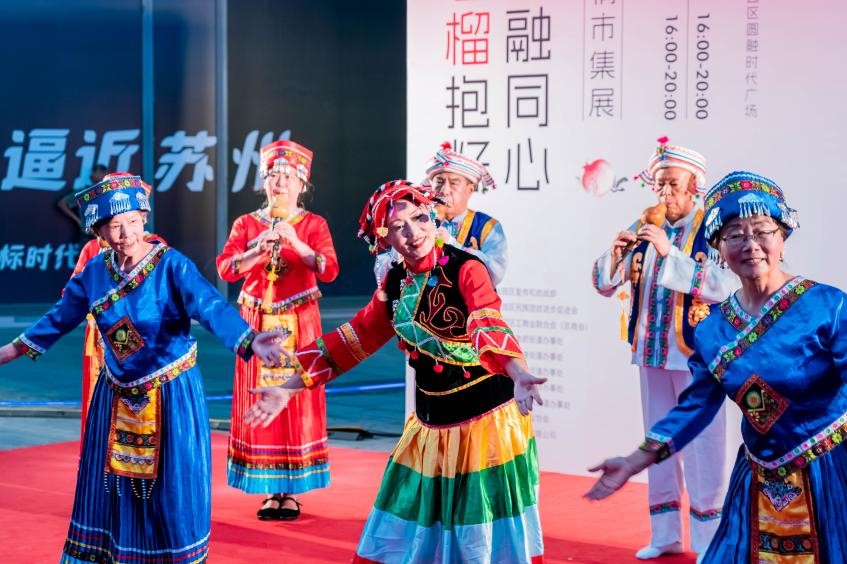 活動中,文藝演出精彩不斷。民族舞《金雞湖之歌》以優美的舞姿展現了園區開放包容的精神風貌;雙人評彈《蘇州好風光》則用吳儂軟語演繹了江南文化的獨特魅力。市集期間,另有《美麗新疆》《阿瓦人民唱新歌》《罐舞傣靈》等七場特色民族舞蹈與樂器表演輪番上演,為觀眾呈現了一場跨越地域的民族藝術盛宴。
