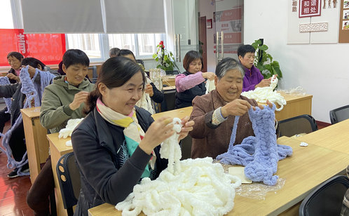 另一邊,“紅管”志愿者正帶領老人們學習手指圍巾的編織方法。無需編織針,僅憑雙手就能完成。大家跟隨講解認真練習,起初手法略顯生疏,棉線總是纏繞打結,但大家遇到問題時互相支招、分享竅門,指尖的棉線漸漸翻飛自如,現場氛圍溫馨融洽、其樂融融。一團團柔軟的棉線在一勾一繞間逐漸成形,一條條簡約實用的手指圍巾陸續(xù)完成。“這手指圍巾織起來簡單、速度又快,出門買菜散步戴著都合適!”李阿姨笑著展示自己的成果,滿足之情溢于言表。