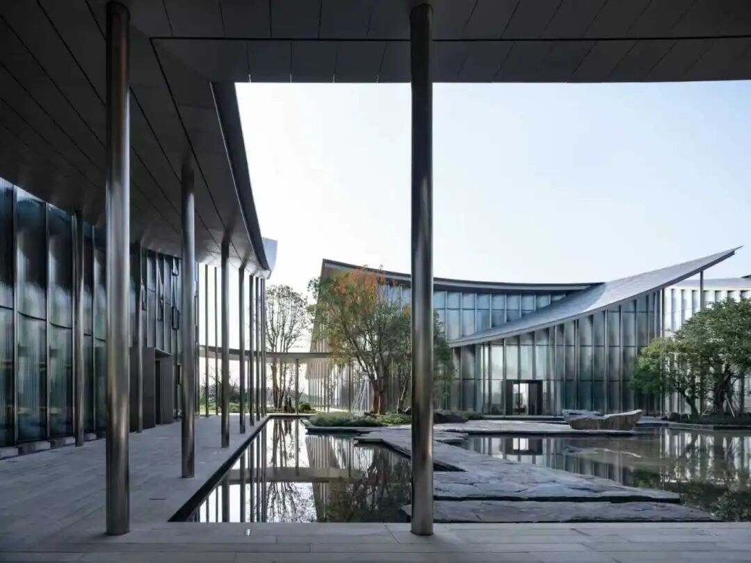 俯瞰整座美術館,絲帶狀屋頂蜿蜒連綿,既是對蘇州園林中“廊”的概念的全新演繹,又巧妙連接起9幢獨棟單體。屋頂的不銹鋼表面和立面的弧形豎向玻璃,又似中國建筑中的琉璃瓦,在陽光下與金雞湖水一起泛動靈動瀲滟之光。一項項匠心巧思讓建筑與景觀交織交融,既具功能性,又有觀賞性,更延展了空間感。