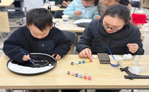 活動現(xiàn)場氣氛溫馨,長桌上提前備好黑色畫盤、顏料及多樣手工材料,孩子與家長攜手合作,全心投入創(chuàng)作過程。有的家庭專注于繪畫,孩子們用顏料在黑盤上勾勒月亮、云朵,家長則協(xié)助點綴彩珠,共同完成充滿想象的“月夜星空”;有的家庭則進(jìn)行創(chuàng)意拼貼,將零散材料組合成各種生動可愛的小動物造型。“原來和媽媽一起做手工這么有意思!”參與活動的張宇昕小朋友展示著自己完成的畫盤,臉上洋溢著自豪的笑容。