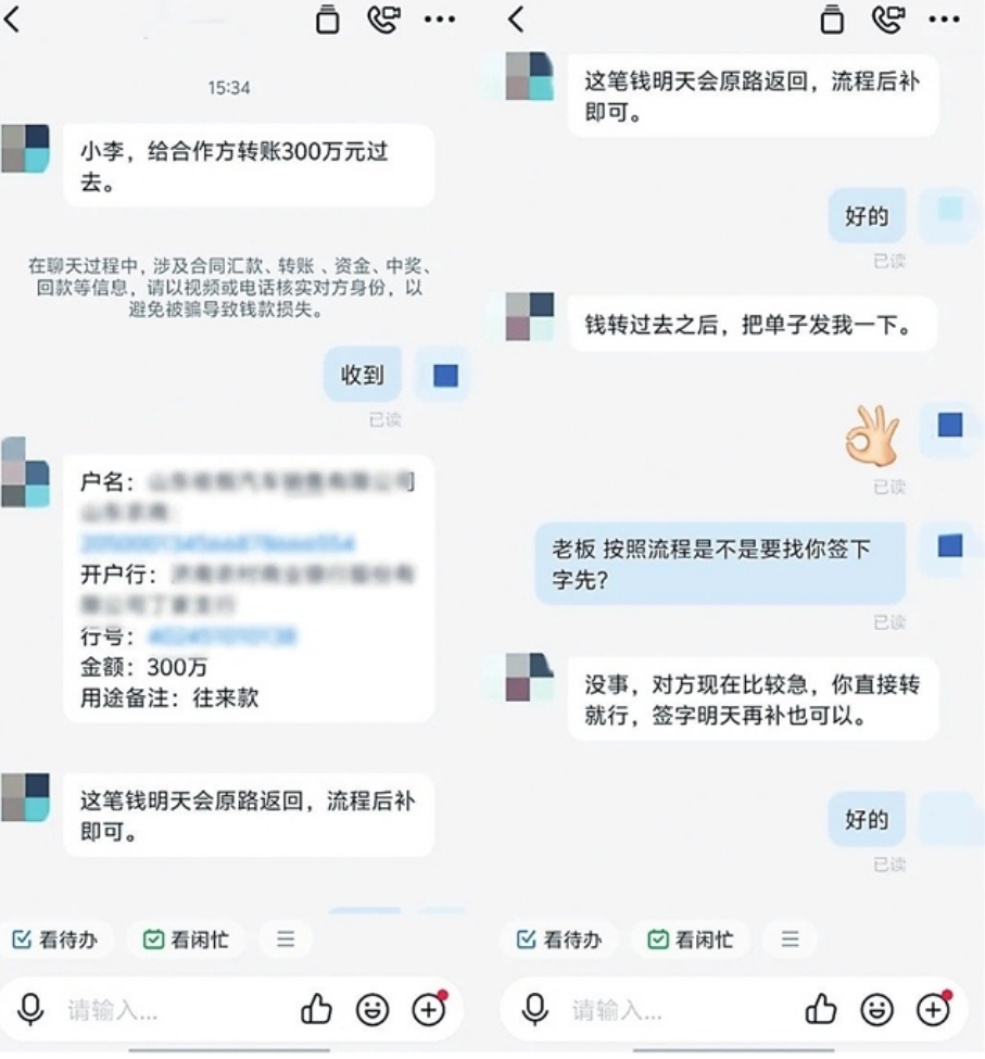 事發當天下午,這家企業的財務人員突然收到一個釘釘群的邀請,點擊進群后發現“老板”赫然在列,同時群里還有一個自稱是“合作方”的人員。“老板”在群里部署稱,因公司業務需要,要求財務人員立即向對方的賬戶轉賬300萬元,還強調這筆錢后續會原路退回,要求先轉賬后補手續。
