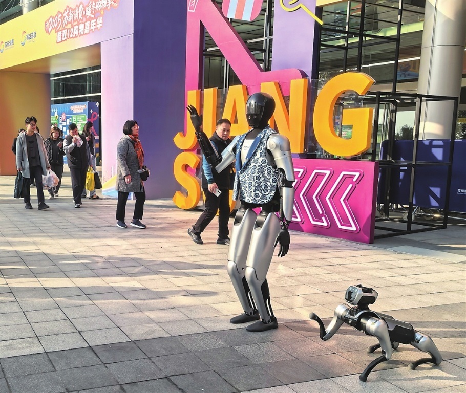 昨日,蘇州國(guó)際博覽中心廣場(chǎng),機(jī)器人與機(jī)器狗舉手相迎,熱情招呼市民進(jìn)館參觀。