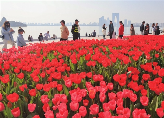 昨天,園區右岸客廳《飛翔》雕塑下,色彩艷麗的郁金香美麗綻放,吸引眾多市民目光。