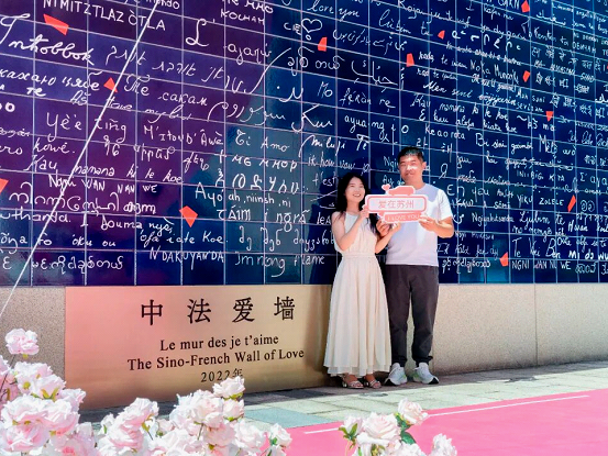Couples who complete their marriage registration at the Sino-French Wall of Love (a replica of the famous Le mur des je t’aime in France) in Ligongdi Cultural and Creative Block and those celebrating the 10th, 25th or 50th anniversary of their marriage this year can enjoy free rides on the “Suzhou Eye” Ferris wheel and the cruise ships heading toward Taohua Island.