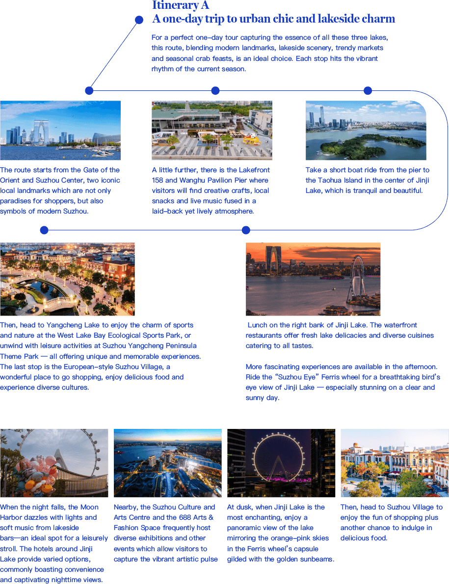 The routes were designed to allow visitors to fullyimmerse themselves in the unique charm of the three lakes in SIP and collectunforgettable memories.“We’ve integrated the most distinctive resources of thethree lakes to offer visitors a richer, more diversified travel experience,”said an official from SIP Culture, Sports and Tourism Office.Highlighting seasonal features, both routes incorporatehairy crab-themed culinary experiences. Moreover, the itineraries integratediverse experiences such as ecological exploration, trendy urban entertainment,cultur...