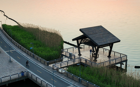 Along the path, wooden pavilions extend over the water, providing perfect spots to rest and immerse in the serene lake views.