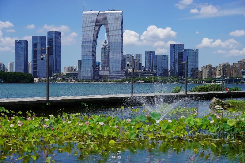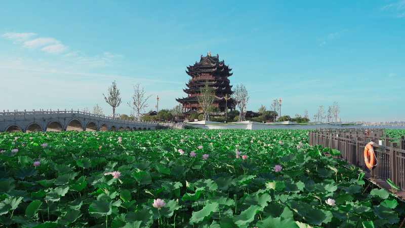 In Chongyuan Temple, a Buddhist temple and popular tourist destination in SIP, the pink lotus flowers standing gracefully above the water render the ancient-style tower particular tranquility and divinity.